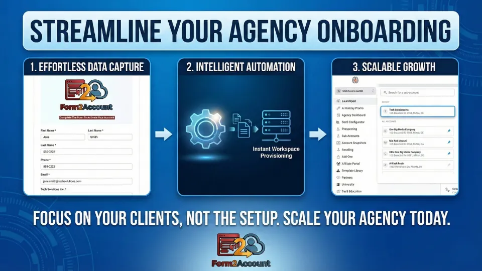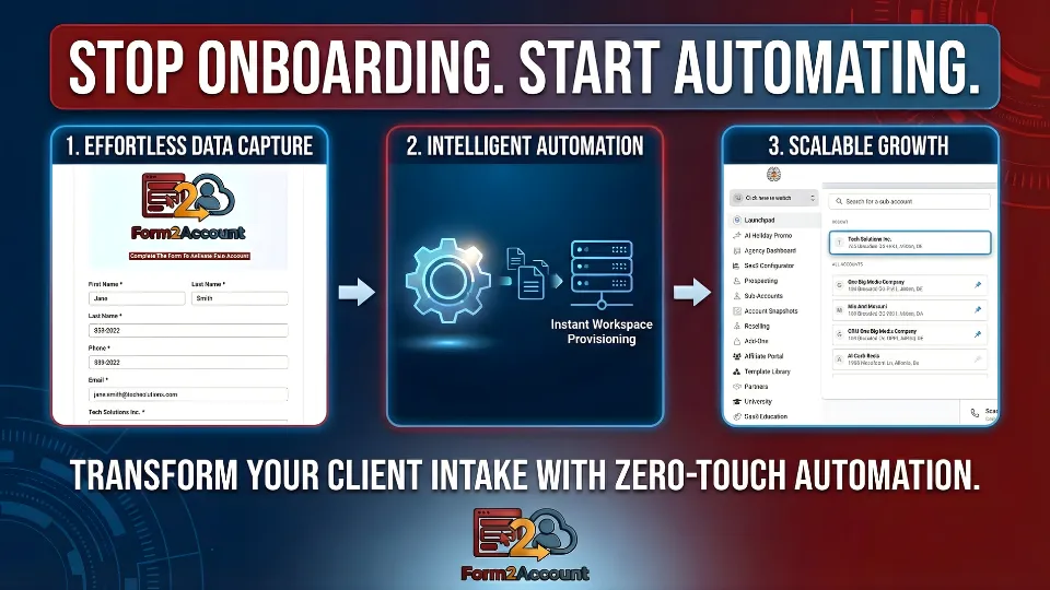 Form2Account is a powerful automation tool designed to fully streamline the client onboarding process. It transforms a standard form submission into a completely functional, ready-to-use workspace, eliminating manual setup and provisioning tasks. This comprehensive guide provides agency administrators and IT implementers with everything needed to successfully deploy, configure, and activate the system.