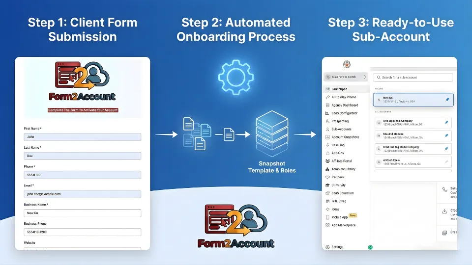 A Sub-Account is the individual, ready-to-use workspace created for each new client. Think of it as the final product of the Form2Account automation. The system uses the client's submitted form data—specifically their First Name, Last Name, Phone, and Email—to create the primary admin user for this new Sub-Account, giving them immediate access.